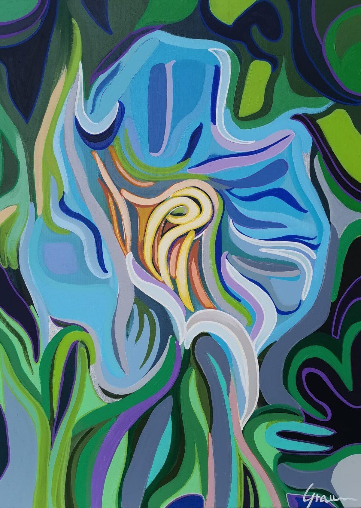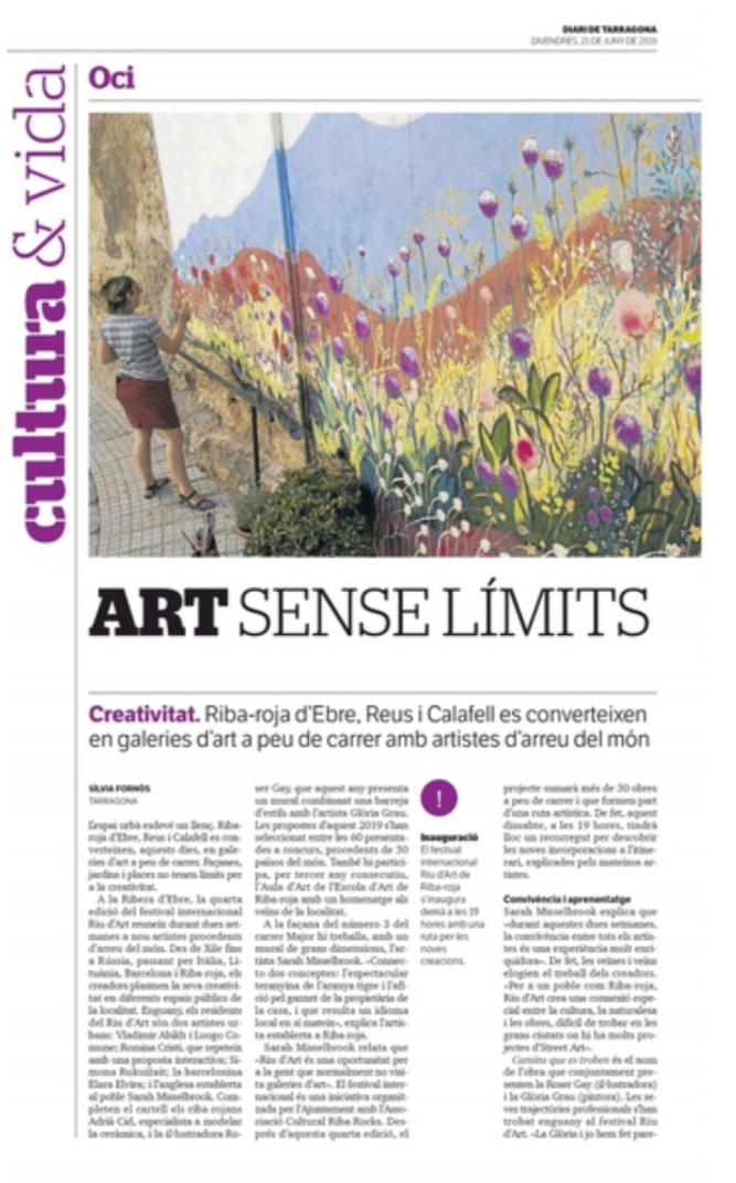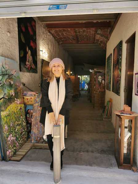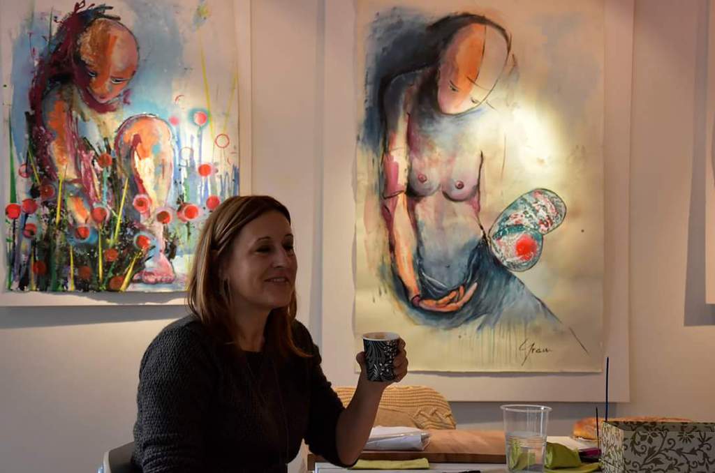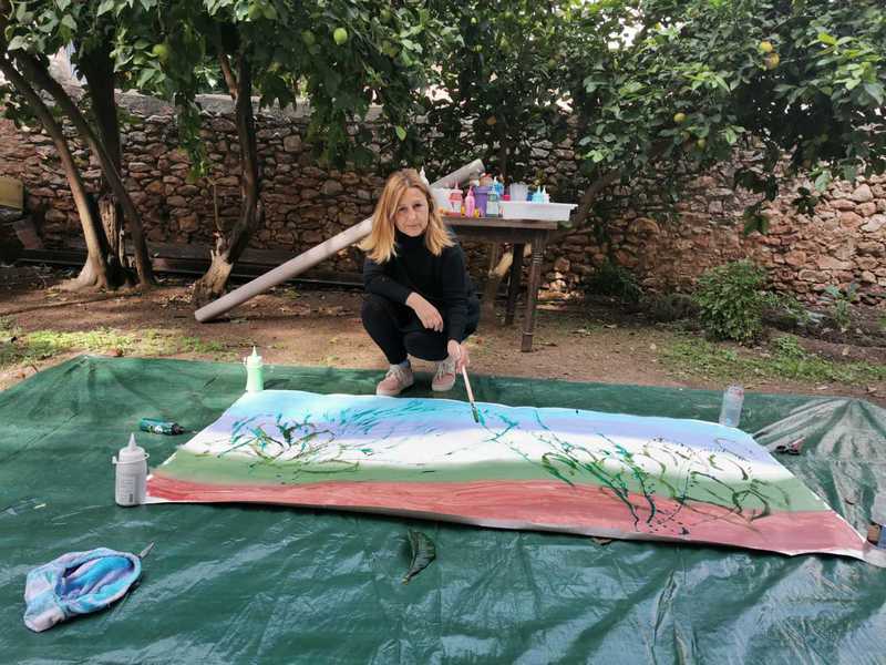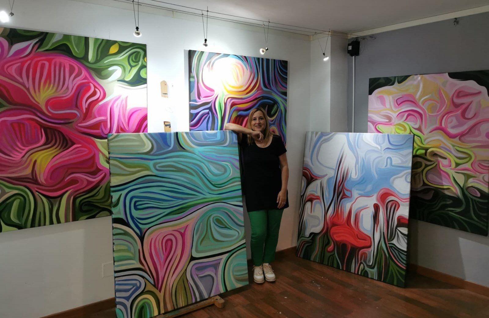 Per trobar-la ens hem de dirigir fins al Vendrell. Poc abans de la pandèmia va instal·lar el seu estudi a una casa cedida per un amic. L’immoble portava tancat més de trenta anys i ara s’ha convertit en un espai ple de vida, amb centenars de pinzells i gammes de colors vius a tort i a dret. Ben segur que el llimoner situat a l’exterior és una gran font d’inspiració. Aquí el temps s’atura i xoca amb la incansable pluja d’idees que constantment brolla de l’artista, dia i nit. La primera confessió: “m’encanta pintar descalça, així que qualsevol catifa que trobo es converteix en part de l’estudi”.