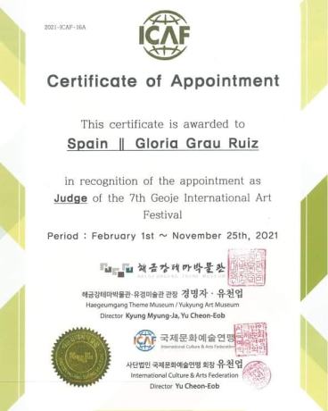 La pintora Gloria Grau Ruiz ha sido seleccionada este año 2021 y 2022 como Jurado del 7º y 8º Festival de Arte Internacional “Peace Again” que organiza el Museo Temático Haegeumgang, situado en la región de Gyeongsang en Corea del Sur.