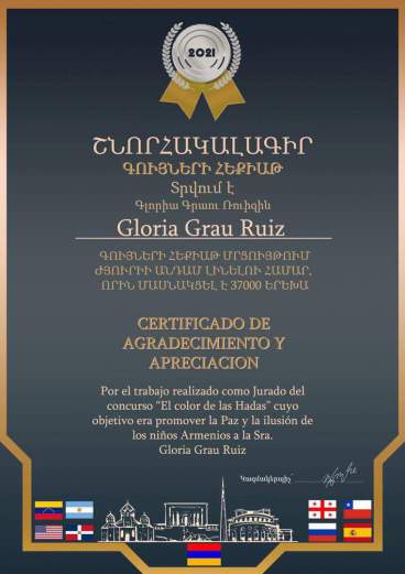 Nombrada jurado del concurso de pintura "El color de las Hadas" (para promover la Paz y la ilusión, después de la guerra) donde se presentaron más de 36 mil trabajos. Fué una selección muy larga y dura pero muy enriquecedora a la vez. Me llevo el cariño de los niños Armenios en mi corazón, el resto del jurado y los promotores del evento.