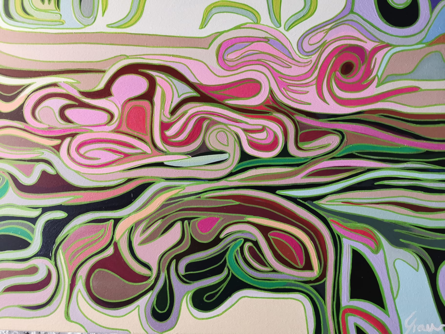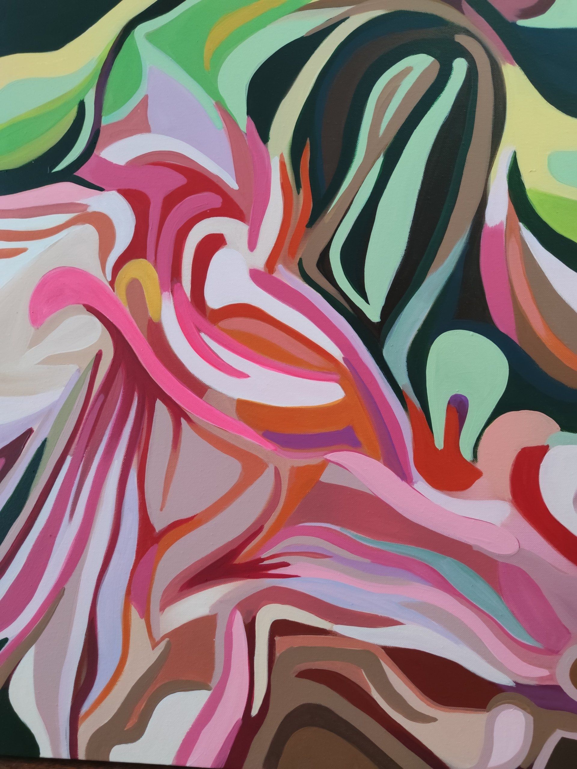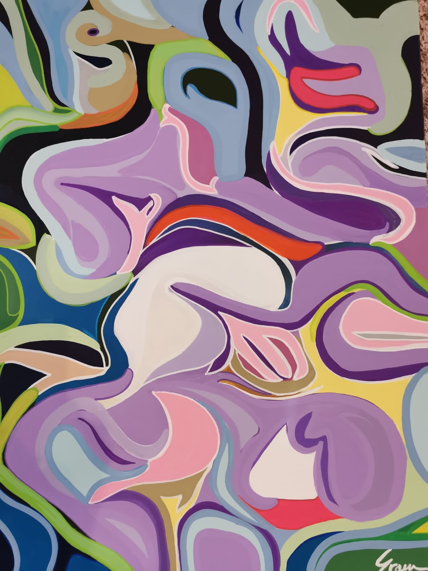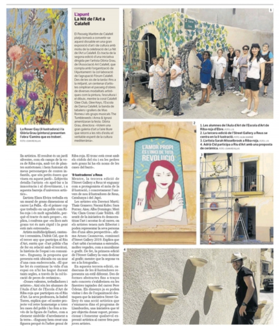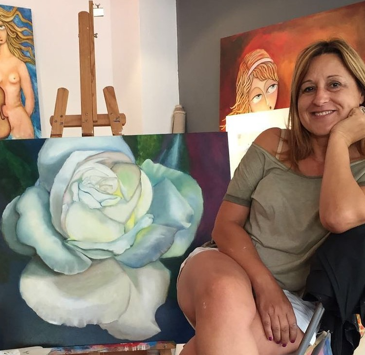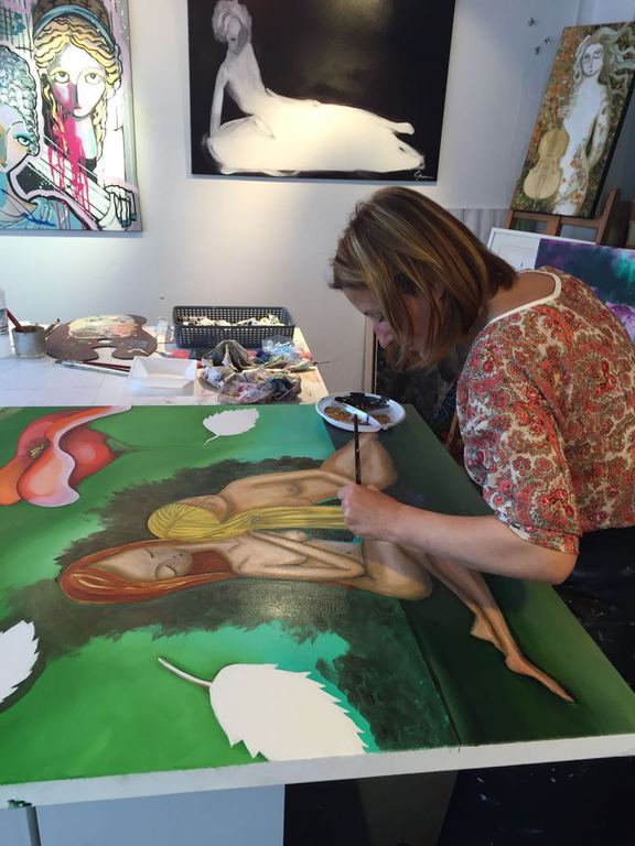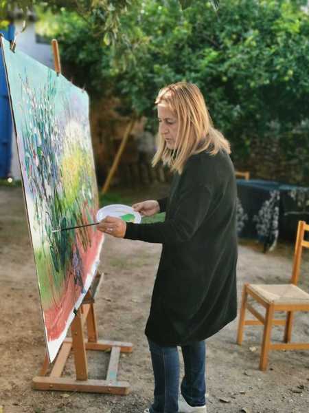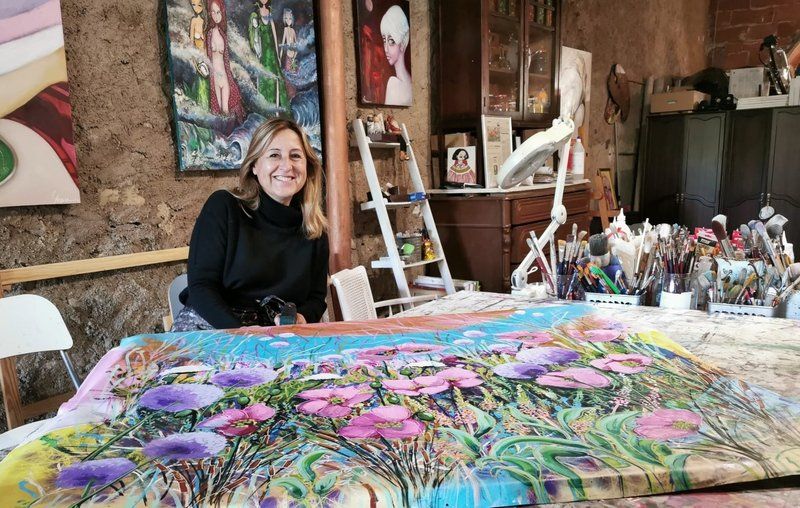 Per trobar-la ens hem de dirigir fins al Vendrell. Poc abans de la pandèmia va instal·lar el seu estudi a una casa cedida per un amic. L’immoble portava tancat més de trenta anys i ara s’ha convertit en un espai ple de vida, amb centenars de pinzells i gammes de colors vius a tort i a dret. Ben segur que el llimoner situat a l’exterior és una gran font d’inspiració. Aquí el temps s’atura i xoca amb la incansable pluja d’idees que constantment brolla de l’artista, dia i nit. La primera confessió: “m’encanta pintar descalça, així que qualsevol catifa que trobo es converteix en part de l’estudi”.