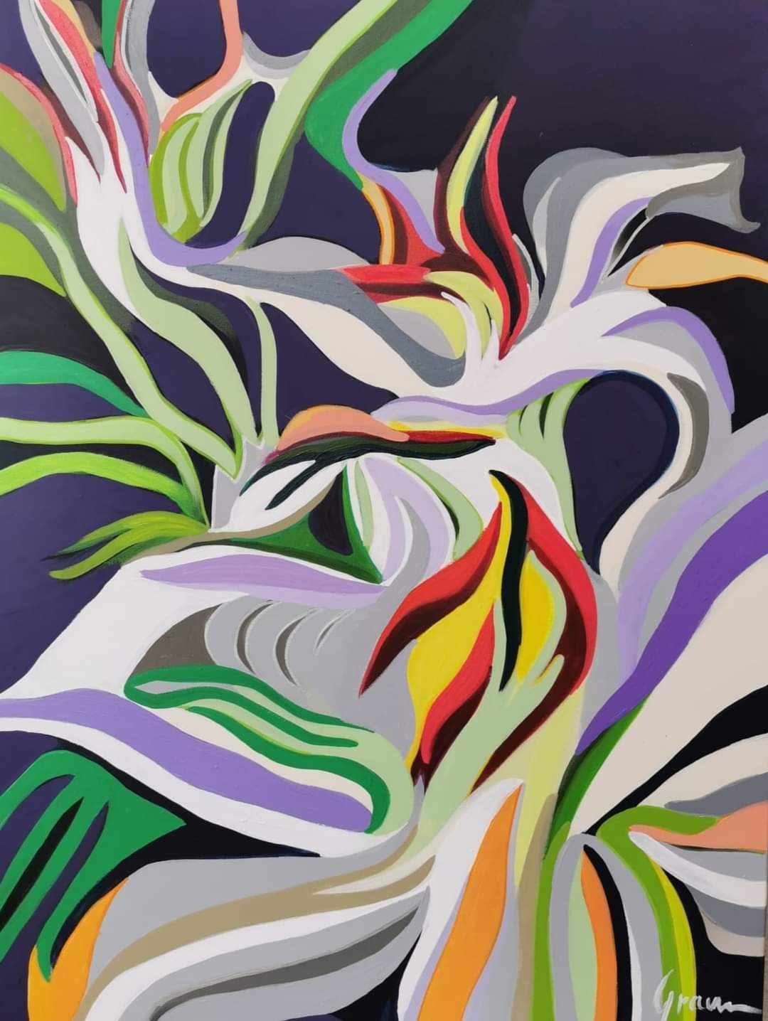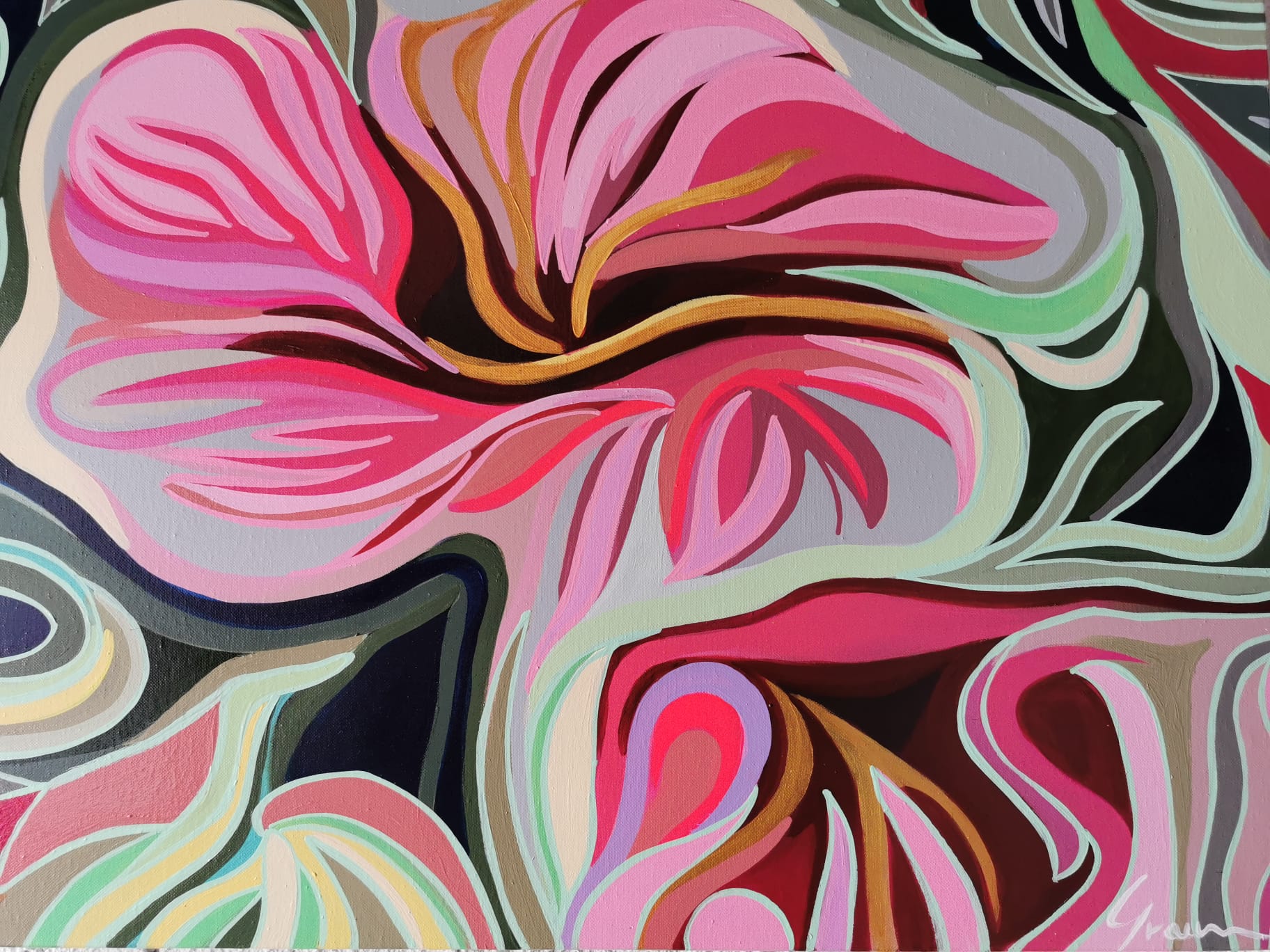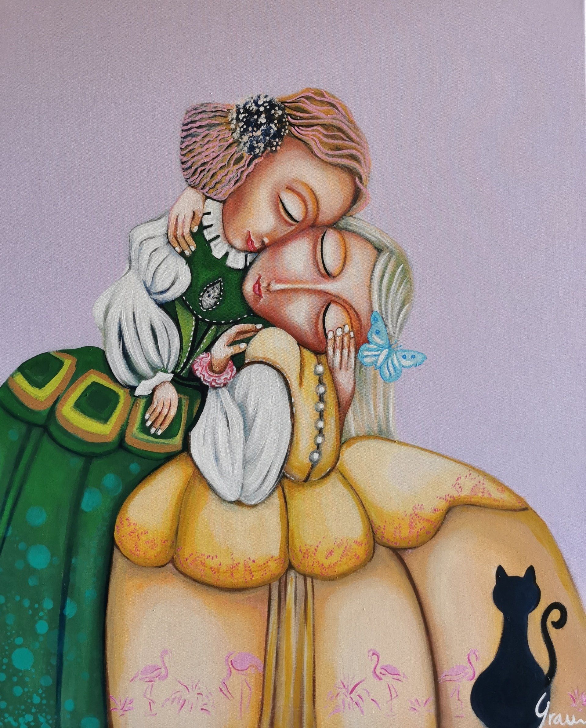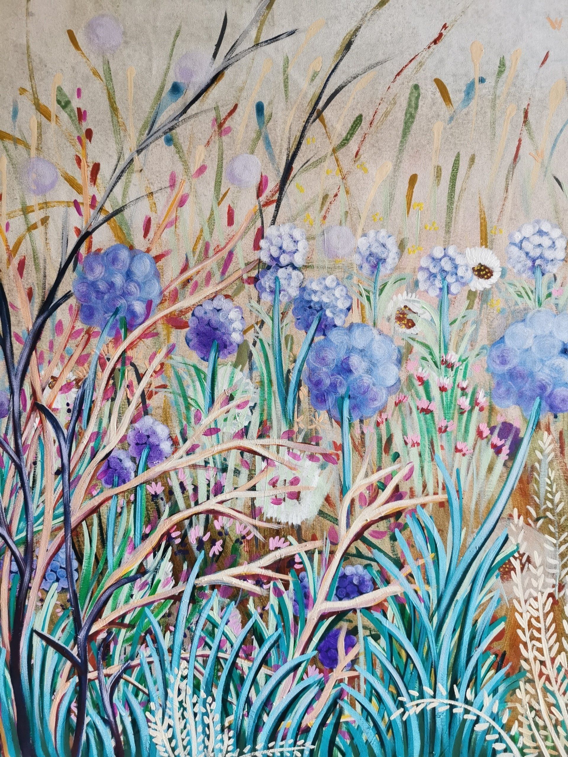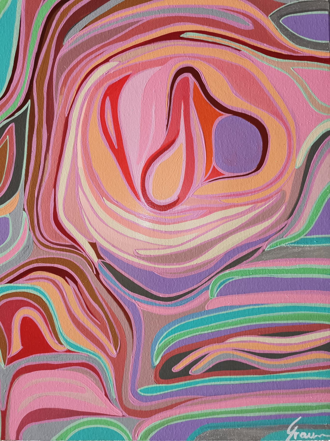 Per trobar-la ens hem de dirigir fins al Vendrell. Poc abans de la pandèmia va instal·lar el seu estudi a una casa cedida per un amic. L’immoble portava tancat més de trenta anys i ara s’ha convertit en un espai ple de vida, amb centenars de pinzells i gammes de colors vius a tort i a dret. Ben segur que el llimoner situat a l’exterior és una gran font d’inspiració. Aquí el temps s’atura i xoca amb la incansable pluja d’idees que constantment brolla de l’artista, dia i nit. La primera confessió: “m’encanta pintar descalça, així que qualsevol catifa que trobo es converteix en part de l’estudi”.