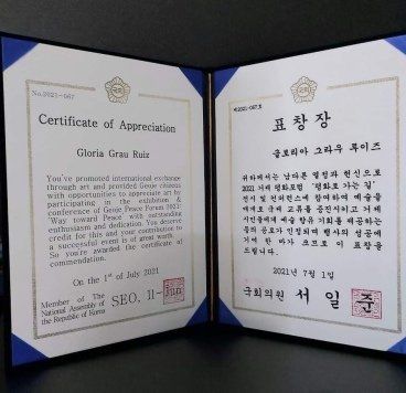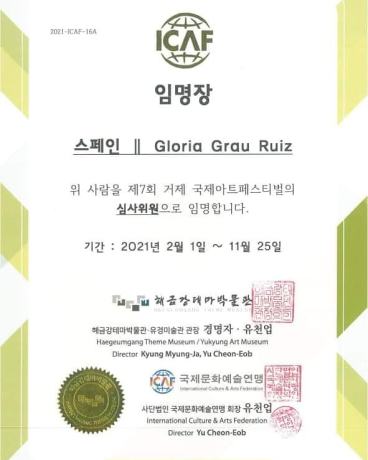 La pintora Gloria Grau Ruiz ha sido seleccionada este año 2021 y 2022 como Jurado del 7º y 8º Festival de Arte Internacional “Peace Again” que organiza el Museo Temático Haegeumgang, situado en la región de Gyeongsang en Corea del Sur.